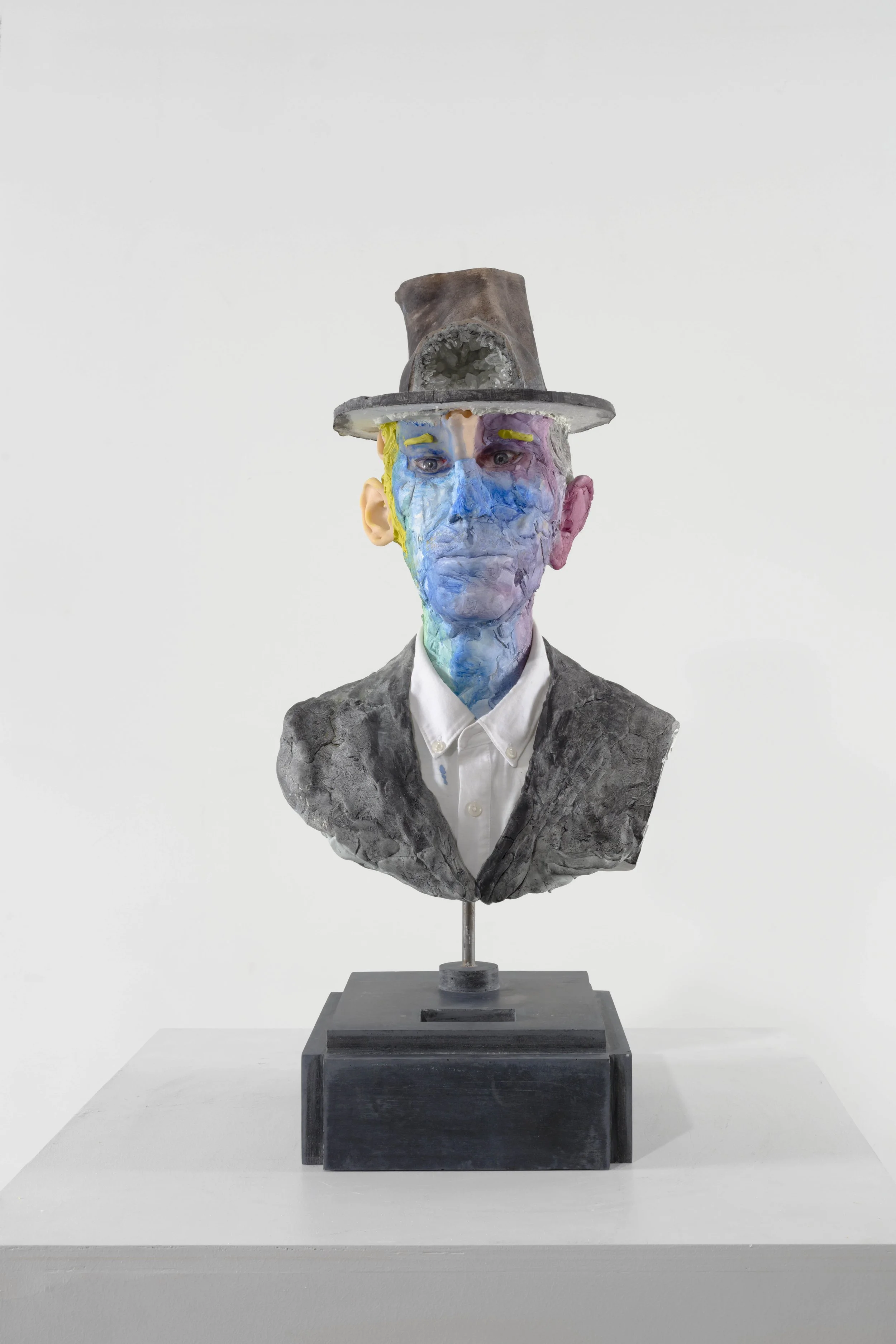 Expanded polyurethane foam, epoxy clay, resin, cement, steel, cotton shirt, acrylic paint, paper, quartz, glass eyes, graphite, coloured pencil and glass gemstone.